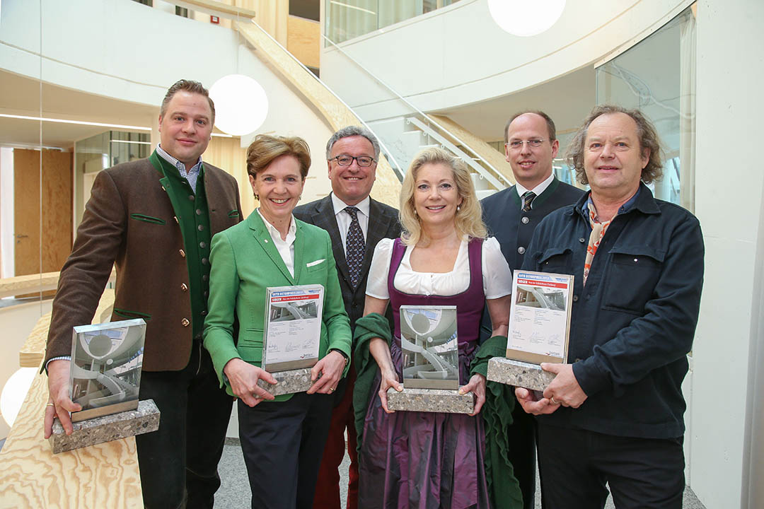 SSK - Gesamtsieger Betonpreis 2017Foto (v.l.n.r.): Josef Eder, LR Brigitta Pallauf, LR Heinrich Schellhorn, Mag. Brunnauer (GF Kronreif Bau), DI Christoph Ressler (Präsident GVTB), Arch. Max Rieder